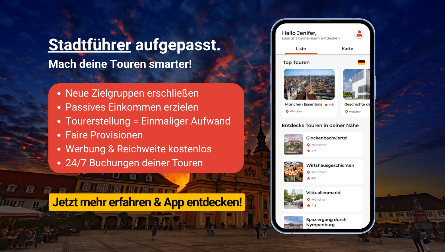 Als Audioguide-Ersteller eröffnen sich vielfältige Möglichkeiten. Du kannst Touren an verschiedenen Orten in deiner Stadt anbieten und so ein breiteres Publikum erreichen, indem du auch weniger frequentierte Orte einbeziehst. Zudem kannst du dein Wissen über weitere Städte teilen, indem du Audiotouren für Orte erstellst, die du gut kennst, auch wenn du nicht dauerhaft vor Ort bist. So machst du dein Wissen einem breiteren Publikum zugänglich und bietest deinen Gästen ein tolles Erlebnis.